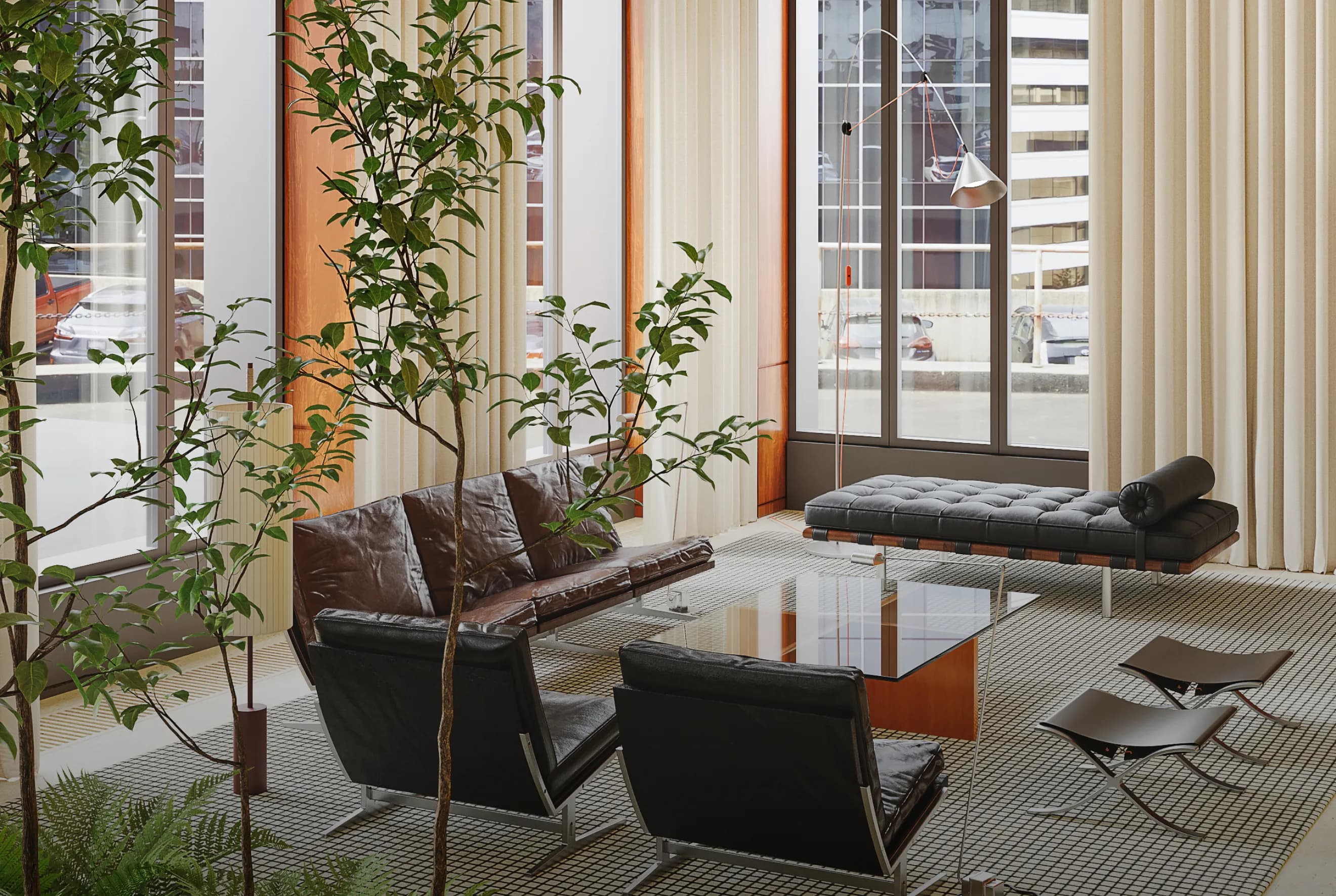 И конечно, изящный контраст: брутальная графика архитектурных элементов смягчена живой зеленью деревьев. Это не просто интерьер, это диалог эпох, где каждая деталь говорит на языке гармонии.